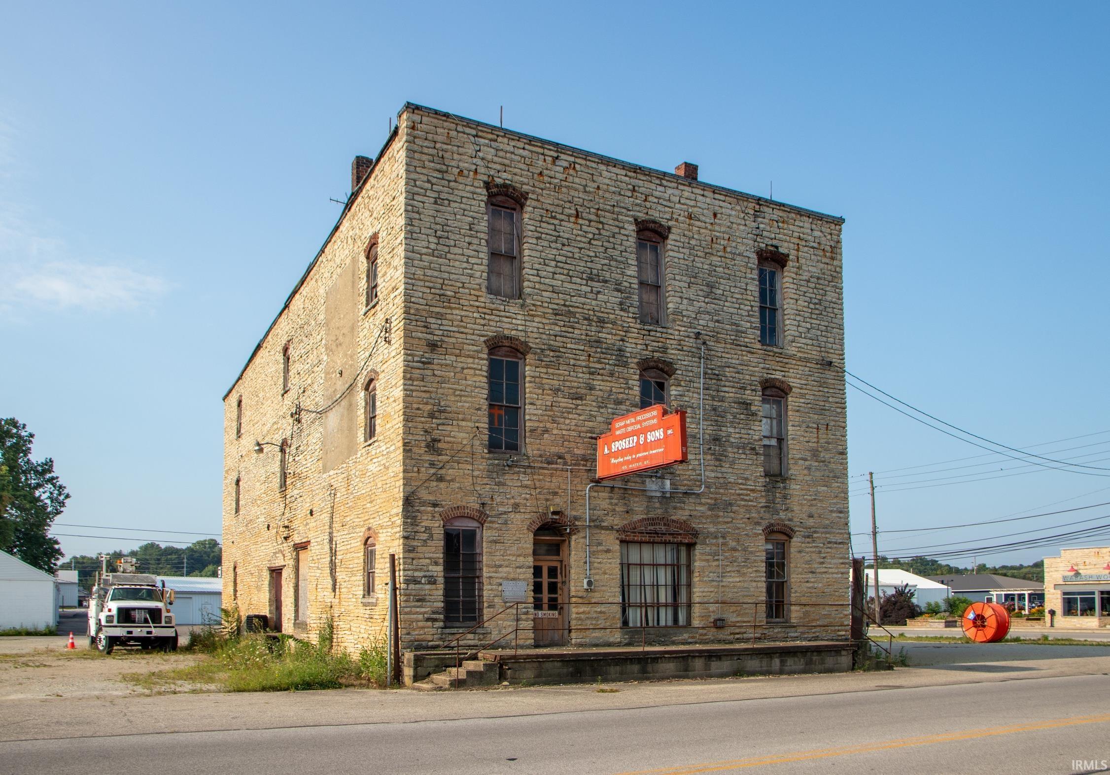 A Rare Chance to Revitalize a Landmark in the Heart of Historic Wabash. Constructed in 1890 of rough-hewn Indiana limestone, the iconic Sposeep Building stands as one of the community’s most distinctive remaining industrial-era structures. Located on Water Street—just one block south of the downtown commercial district—this commanding 3-story building (plus full basement) offers approximately 3,276 sq ft per floor and showcases remarkable original features throughout: massive, exposed timber beams and columns, rustic limestone walls inside and out, original plank wood flooring, and ceiling heights ranging from 10–13 feet. Set on a prominent corner lot, the building’s expansive open floor plans provide exceptional flexibility for adaptive reuse—studio or workshop space, creative offices, gallery, mixed commercial concepts, or other visionary pursuits suitable to local guidelines. Its character-rich envelope and authentic industrial detailing make it an extraordinary canvas for a buyer committed to sensitive restoration and preservation. The property previously underwent IDEM-guided environmental remediation due to historic industrial use. Documentation, reports, and ongoing use limitations are available in the attached environmental and remediation records. Any acceptable purchase offer will require final approval from both the City of Wabash Redevelopment Commission and the Indiana Landmarks Foundation Board of Directors. The property will be subject to protective covenants & right of first refusal. This is a significant opportunity for a preservation-minded buyer to bring new life to one of Wabash’s most recognizable historic structures while contributing to the continued revitalization of the downtown district.